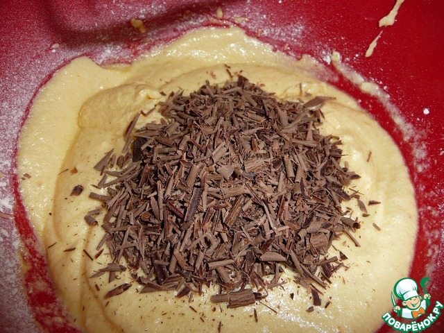 В готовую смесь всыпать тертый шоколад и коротко взбить.