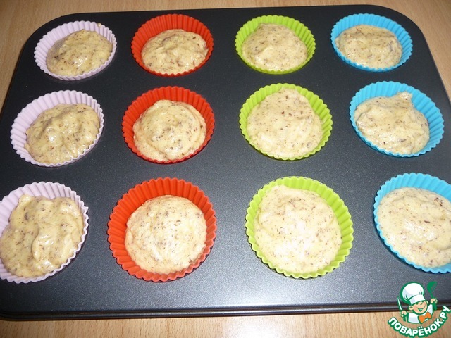 Формочки для кексов смазать маслом, силиконовые не смазывать. Заполнить тестом на 2/3, тесто жидковатое, слишком много не заливайте (убежит).