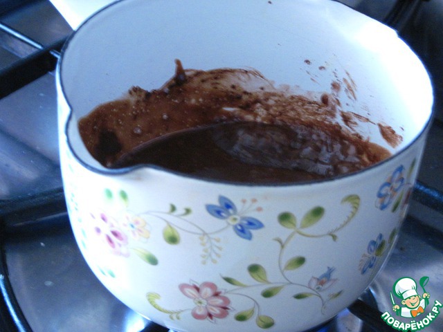 Приготовим шоколадную глазурь. Смешаем сметану, сахар, какао и варим несколько минут постоянно помешивая, пока смесь загустеет. Положим в нее кусочек масла, поварим еще несколько минут.