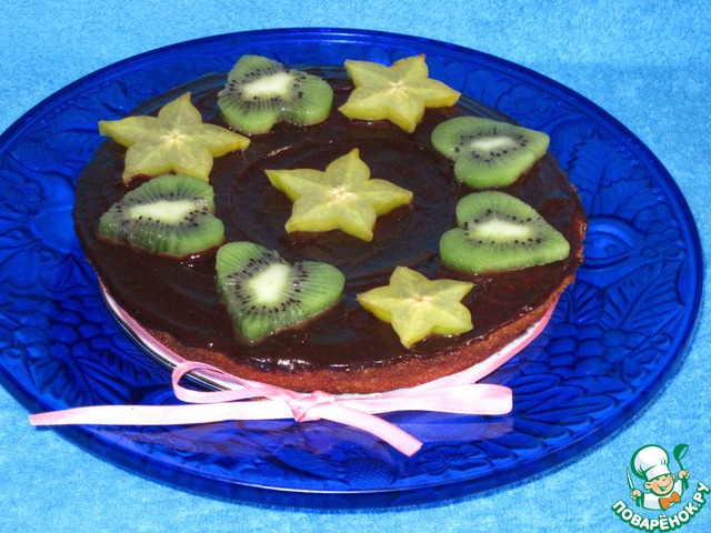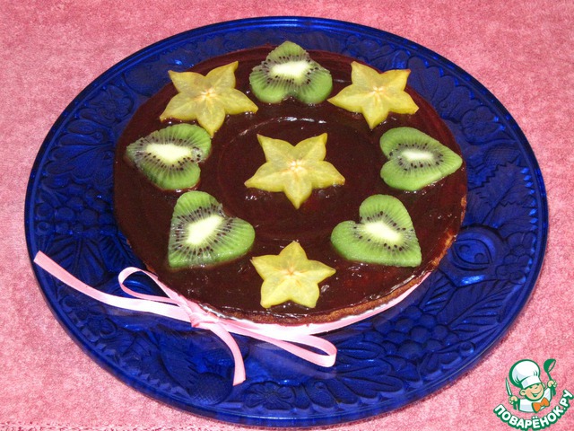 Кекс сверху промажем шоколадной глазурью. Поставим в холодидьник на 10 минут. В это время нарежем фрукты. Вынем готовый кекс и украсим по своему усмотрению. Я сделала сердечки из киви, и четыре звезды - капитанское звание.