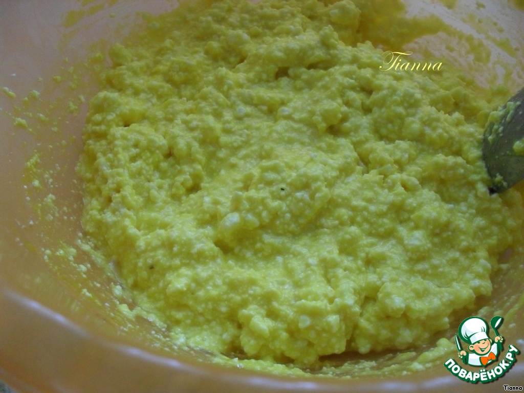 Творог нужно растереть (не обязательно до однородной массы, просто чтобы не было крупных комочков, только если он не слишком сухой), добавить яйца и перемешать.