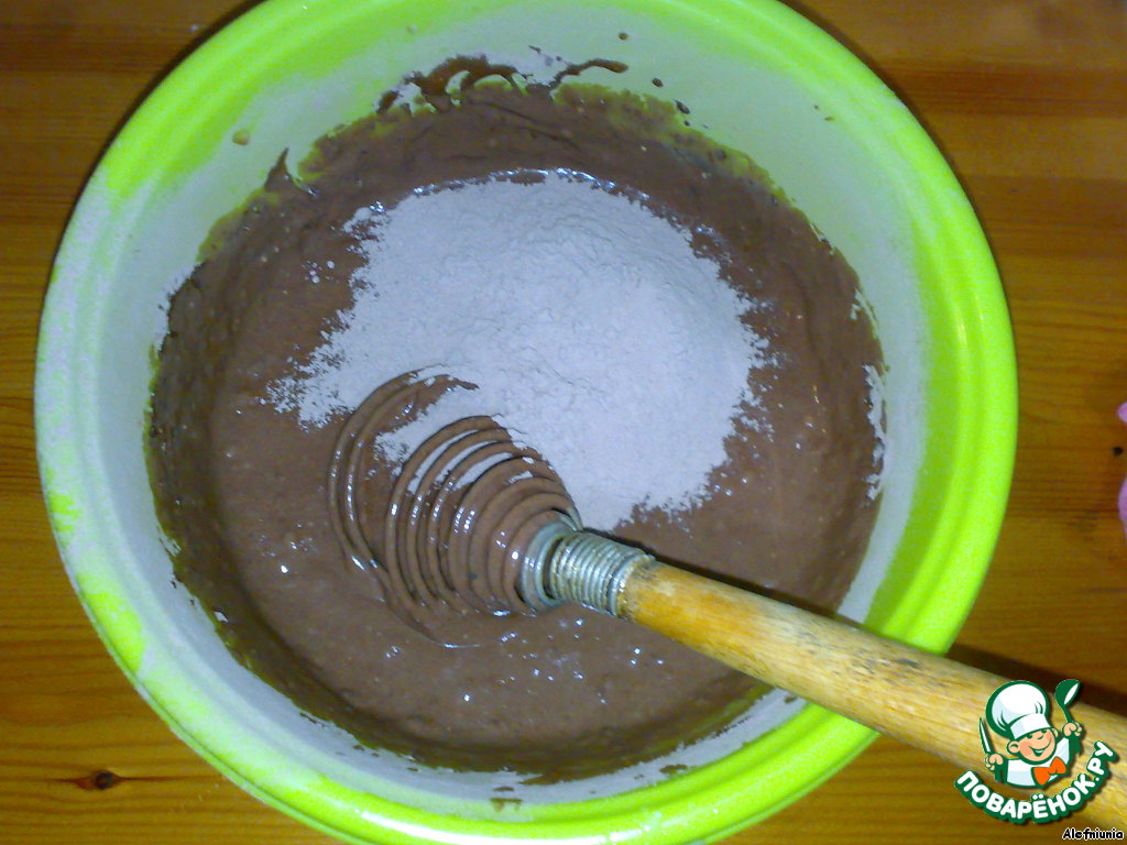 Хорошо перемешать и всыпать муку с разрыхлителем и какао.