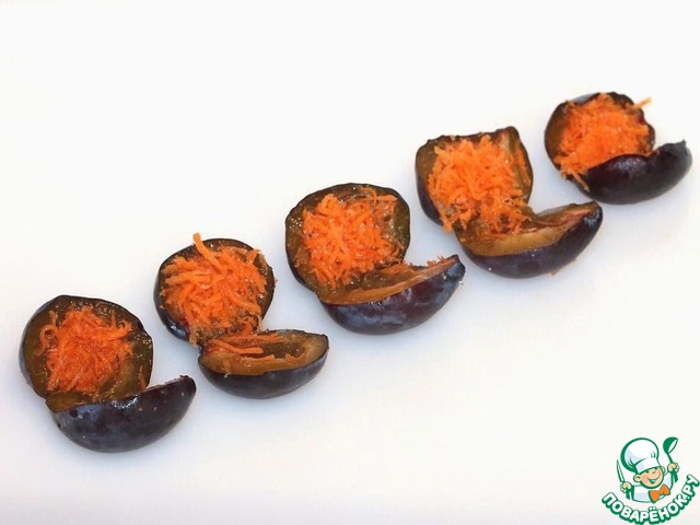 Натираем морковь на средней терке, выжимаем сок. Кладем в морковь немного сахара, перемешиваем, но не растираем и заполняем середину сливы. Закрываем две половинки сливы, обваливаем в крахмале. Начинка готова.