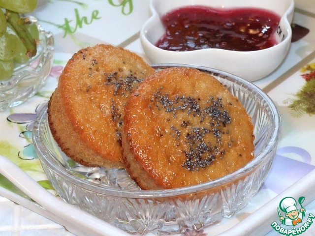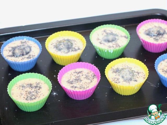 Разливаем тесто по формочкам, примерно 3/4. Раскладываем обваленную в крахмале сливу или виноград. Посыпаем немного сверху маком.