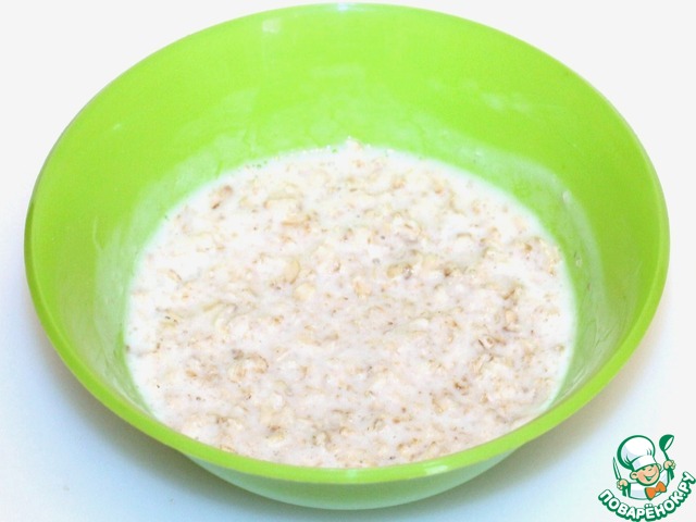 и заливаем теплым кефиром. Добавляем 1 ст. л. сахара и немного питьевой соды не гашеной, хорошо перемешиваем. Даём настояться под крышкой минут 15.