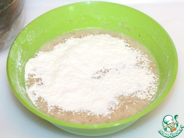и выливаем к хлопьям. Взбиваем тесто до состоянии густой-густой сметаны.