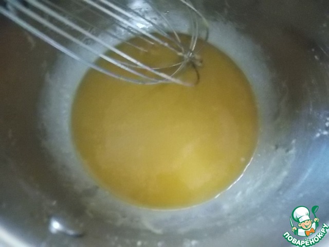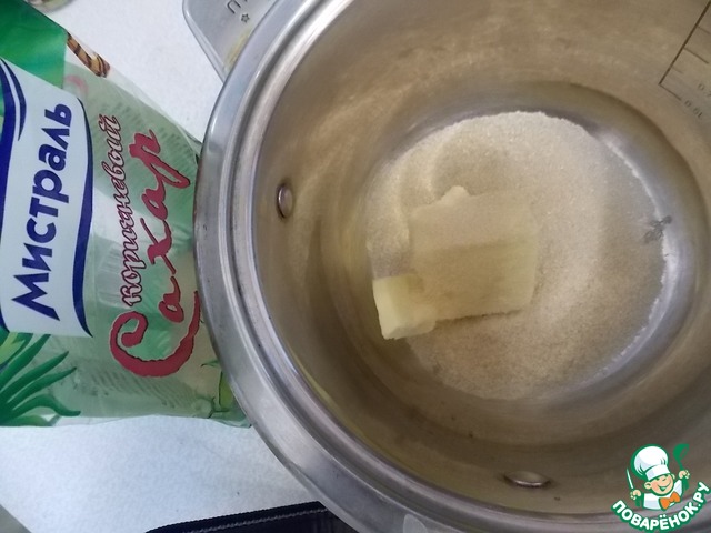 Через 10 минут, после того как поставили в духовку кекс, делаем наш крустильян. Для этого соединяем масло и сахар в кастрюльке и растворяем на медленном огне до однородной массы. (Если в процессе сахар растает, но не будет смешиваться с маслом, добавьте чуть-чуть горячей воды.)Снять с огня и немного остудить.