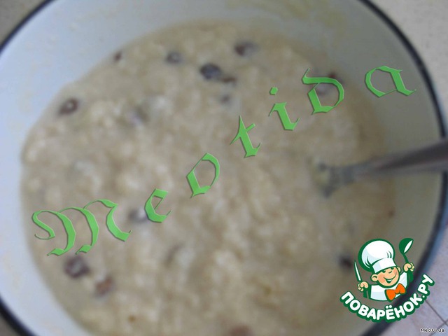 Смешать мучную смесь с жидкой, добавить изюм. Хорошо перемешать.