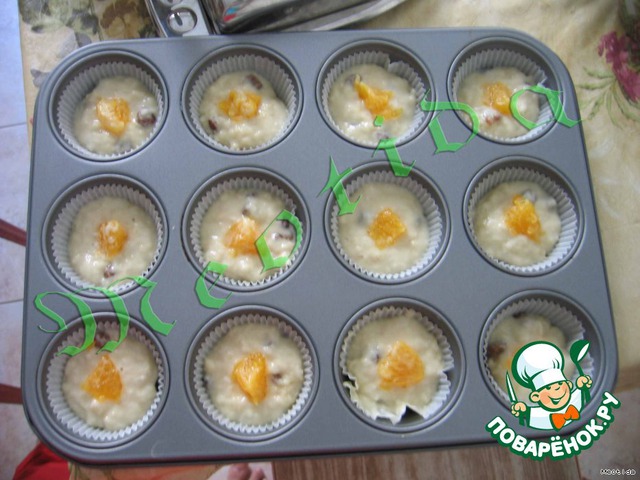 В форму для выпекания положить бумажные формочки, заполнить на 1/2 тестом, положить в центр кусочек апельсина.