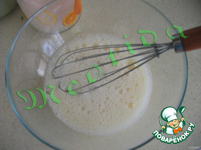 Яйцо, растительное масло и шампанское взбить венчиком.