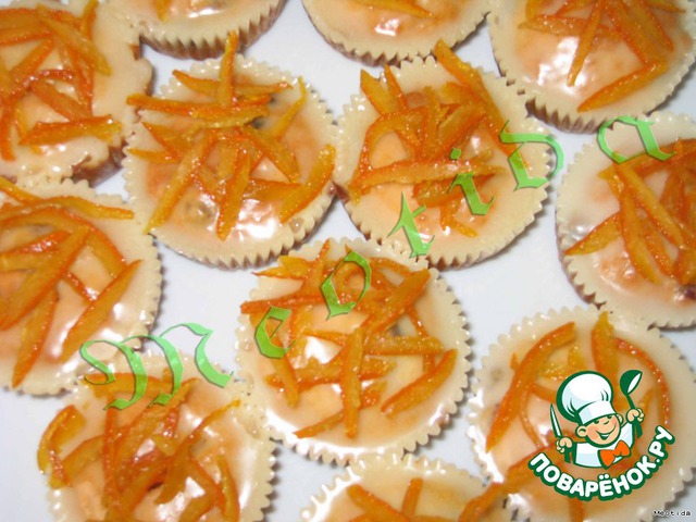 | кексики с сильным запахом и вкусом апельсинов.. кусочек фруктика внутри, кисло-сладкая апельсиново-лимонная помадка и засахаренная апельсиновая цедра сверху.. |