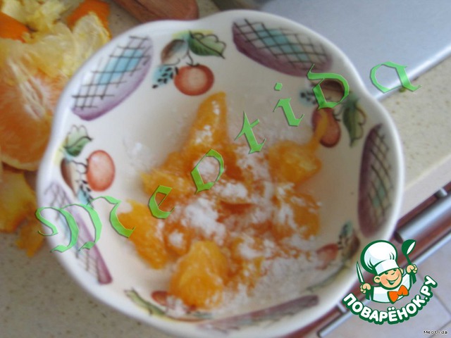 Апельсин очистить от кожи, пленок и косточек, порезать небольшими кусочками (одна долька на три части).