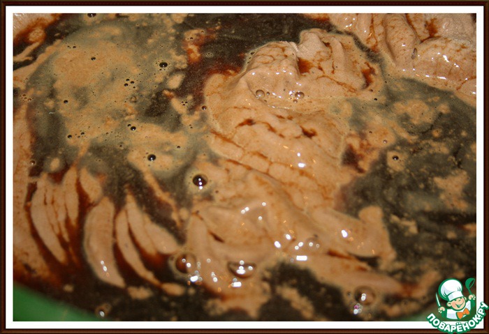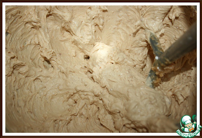 9. Добавьте кофе (кипяток) и хорошо взбейте. Добавьте муку и взбейте.