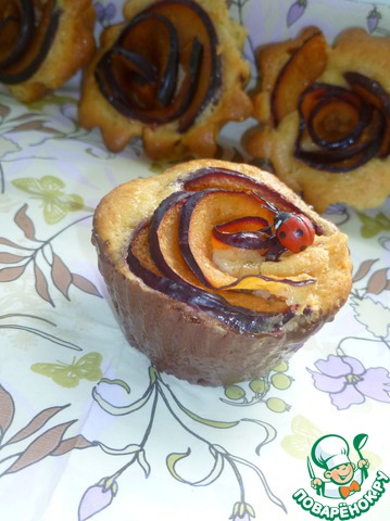 Смазать маленькие формочки для кексов сливочным маслом и выложить в них 2/3 теста. Украсить сливами в форме розочек. Выпекать при температуре 180С 20-25 мин.