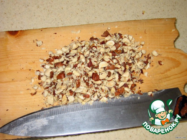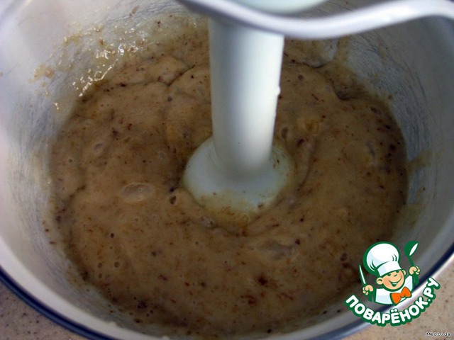 В мучную смесь влить банановую смесь, добавить орехи (оставить немного для посыпки) и коньяк. Все хорошо размешать.