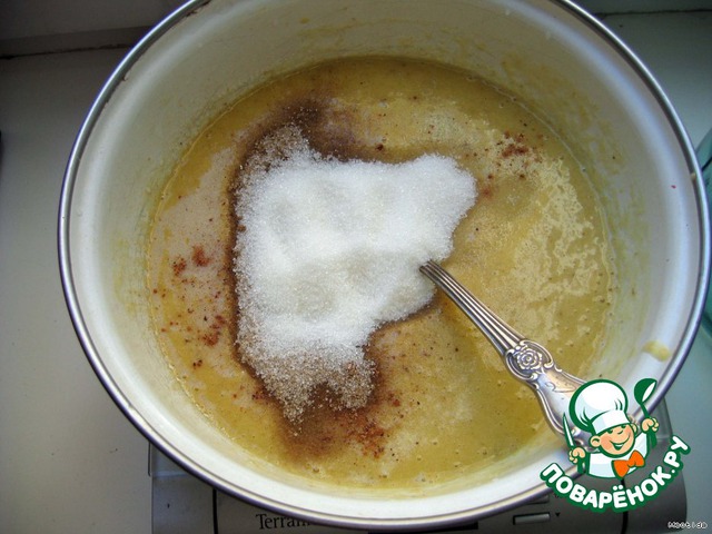 В бананы добавить яйца, ванилин, корицу, мускатный орех, растительное масло и сахар, все хорошо перемешать.