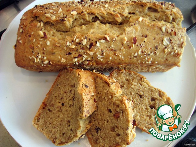 Длинную глубокую форму смазать маслом, застелить бумагой для выпекания, вылить тесто. Сверху посыпать орешками.