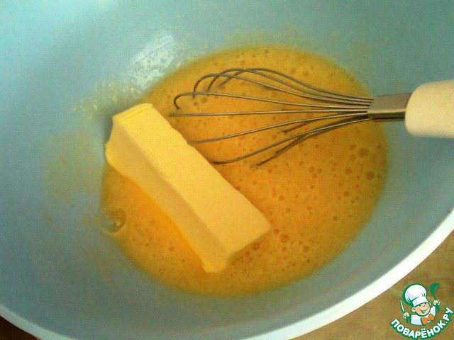 Яйца разотрем с сахаром. Добавим размягченное сливочное масло и все хорошенько перемешаем.