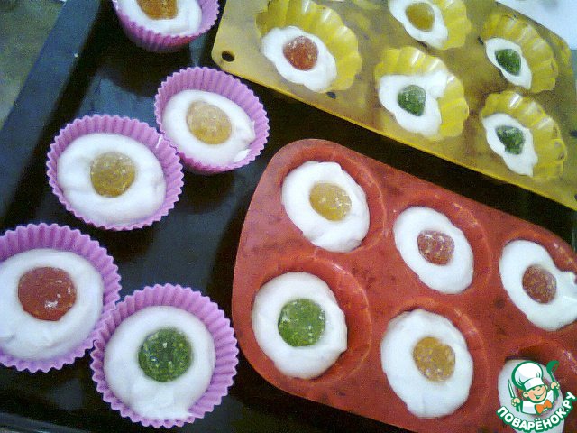В каждую лунку выложить полную столовую ложку теста, а сверху мармелад (можно мармеладные конфеты).