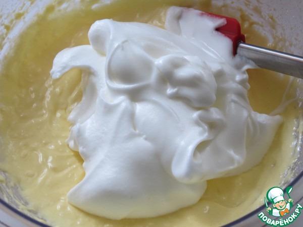 Отдельно взбить белки с солью до пика, добавить сахар и взбить ещё2 минуты. переложить взбитые белки в крем и аккуратно всё перемешать ложкой.