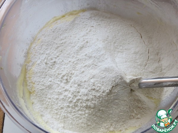 Добавить просеянную муку с крахмалом и разрыхлителем. всё аккуратно перемешать ложкой.