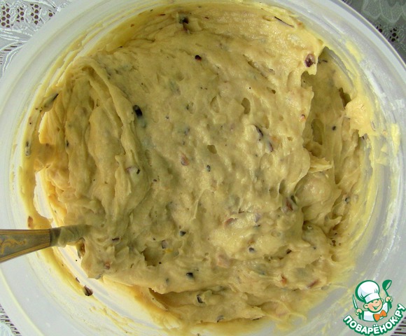 Взбить венчиком мягкое масло с миндальными лепестками и 120 г сахара. Добавляем молочно-яичную смесь (масса получается как с зернышками- не пугайтесь) перемешиваем хорошо. Добавляем мучную смесь и все аккуратно перемешиваем.