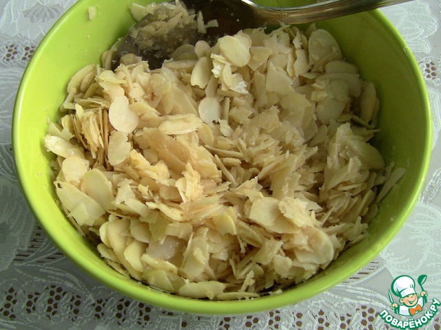 Миндальные лепестки 80 г которые будем добавлять в тесто надо немного обжарить на сухой сковороде.