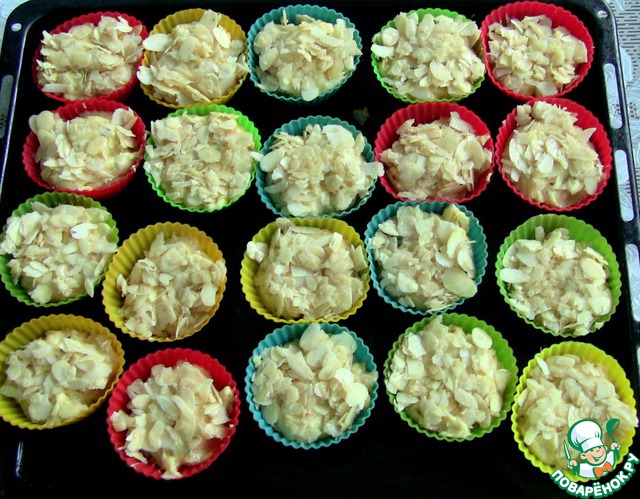 Небольшое количество миндального топпинга выложить на каждый маффин, немного надо прижать ложечкой.
