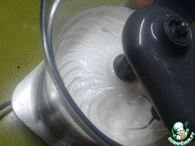Взбиваем белки, добавляя по ложке сахар. Получаем густую пену.