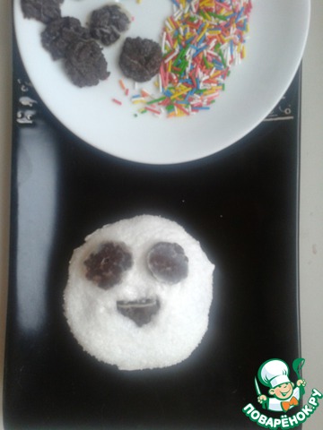 Из белкового крема делаем белки глаз. Сверху шоколадной крошкой. Рот делаем из присыпки для кулича. Фантазия расскажет, какие эмоции нарисовать)