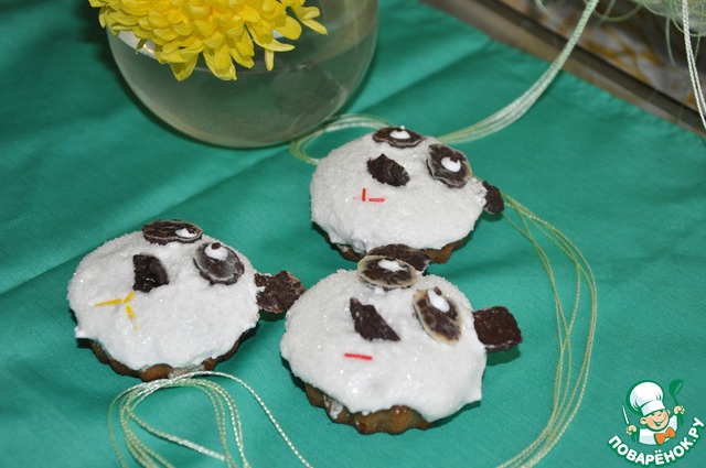 Из шоколадных точек делаем ушки, нос, основу для глаз.