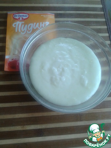 Пудинг можно брать любой ( у меня был сливочный). Готовим его по рецепту. Если нет, то вполне подойдет заварной крем. Закрываем готовый пудинг/крем пленкой, чтобы не было комков.