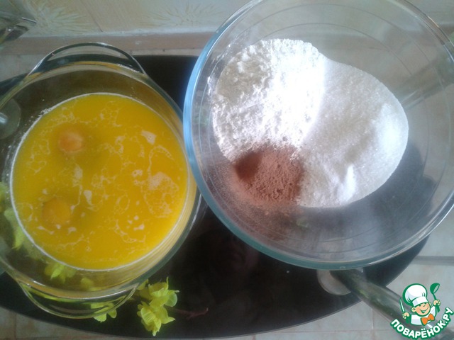 Смешиваем отдельно сухие продукты: мука, сахар, соль, разрыхлитель, какао. И жидкие: молоко, топленое сливочное масло, яйца. Вымешиваем тесто.