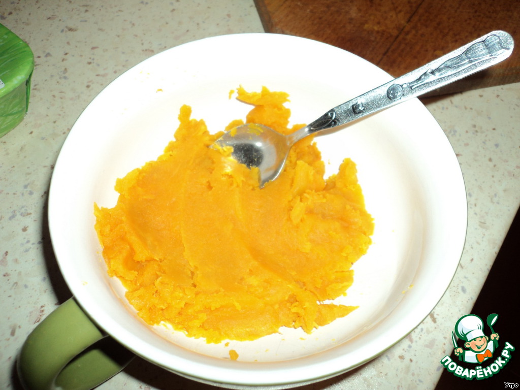Для начала готовим тыквенное пюре. Я это делала в микроволновке. Отрезала нужный кусочек тыквы и ставила в микро на 5 минут. Остужала и потом ложечкой соскабливала со шкурки.