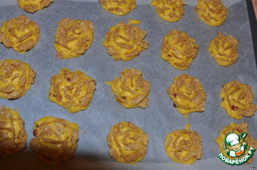 Так как у меня нет формы для маленьких кексиков, то пришлось тесто выложить на противень. Сверху из кукурузных хлопьев стараемся выложить лепестки роз. Лучше втыкать их еще чаще, чем я, потому что во время выпечки тесто разойдется, и лепестки разъедутся, и сложно будет догадаться, что это розы :)) именно так и вышло у меня :)