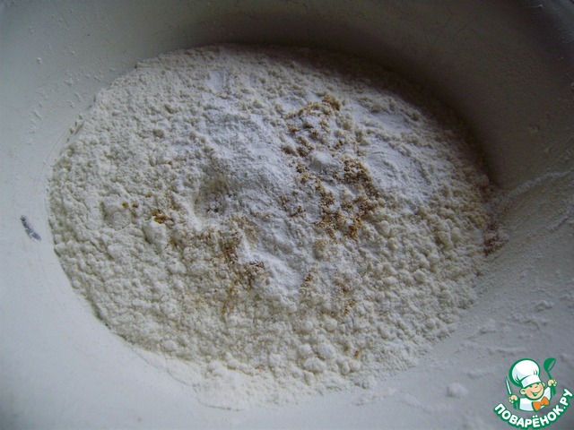 Смешиваем сухие ингредиенты: муку, разрыхлитель, имбирь, соль