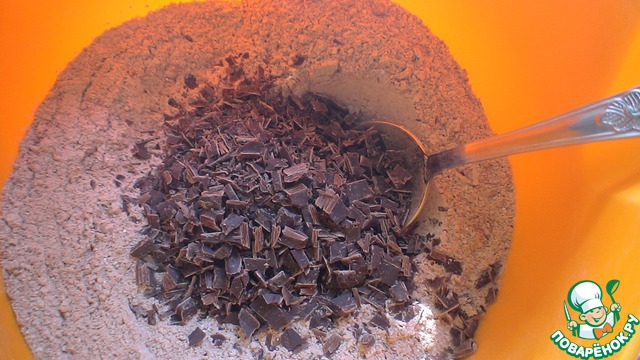 Шоколад (50 г.) натереть на крупной тёрке или нарезать средней стружкой ножом и добавить в сухие ингредиенты.