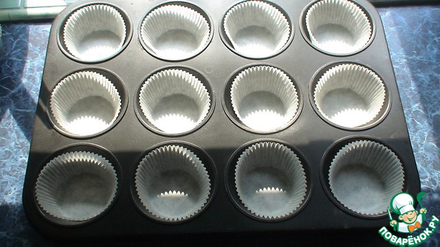 Берем форму для кексов, выкладываем бумажные формочки. Если нет формы для кексов, формочки необходимо поставить в круглую форму для торта. Если нет бумажных формочек, значит, форму для кексов смазать размягченным сливочным маслом и обильно присыпать сухарями.