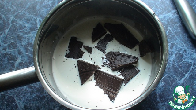 Приготовим глазурь. В посуду влить сливки, добавить шоколад (70 г.)