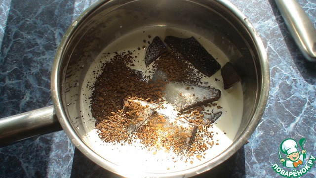 Туда же сахар (3 ст. л.) и кофе (0,5 ст. л.). Ставим на медленный огонь и постоянно помешивая держим до полного распускания шоколада и сахара.