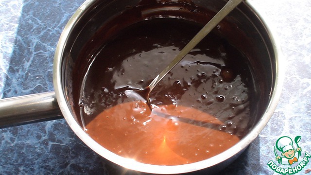 Когда растворился шоколад и сахар, влить в глазурь распущенный крахмал при постоянном помешивании (чтобы не образовалось комков) и варить еще 1-2 минуты (до первых признаков начала кипения). Глазурь готова.