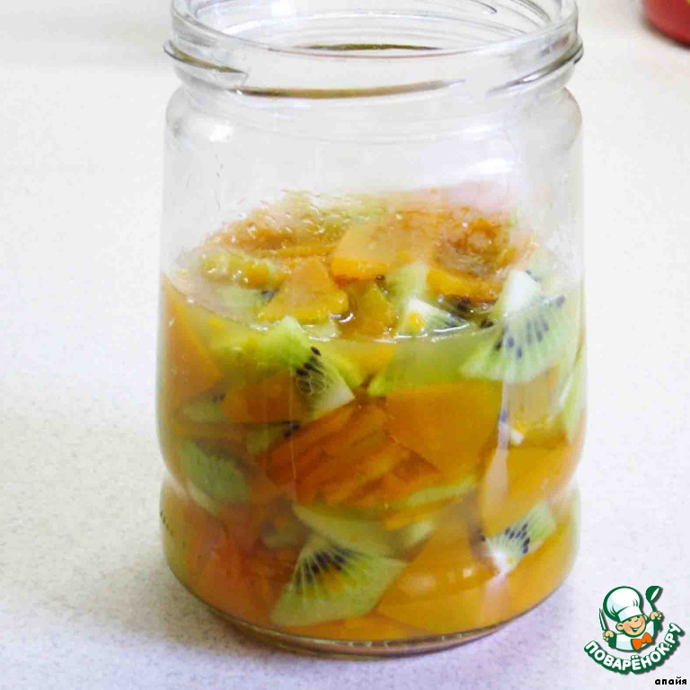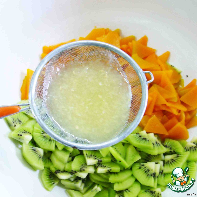 В удобную емкость я положила тыкву и киви. Добавила лимонный сок, процедив его.