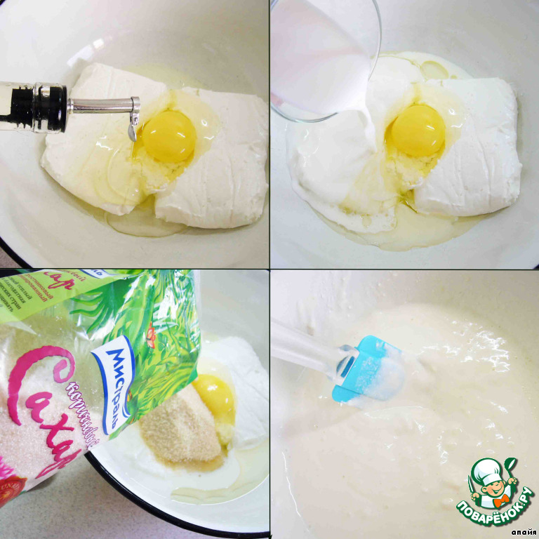 Для приготовления кексов я взяла творог, яйцо, добавила масло, молоко и, конечно же, коричневый сахар фирмы "Мистраль". Все тщательно перемешала.