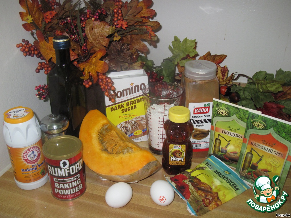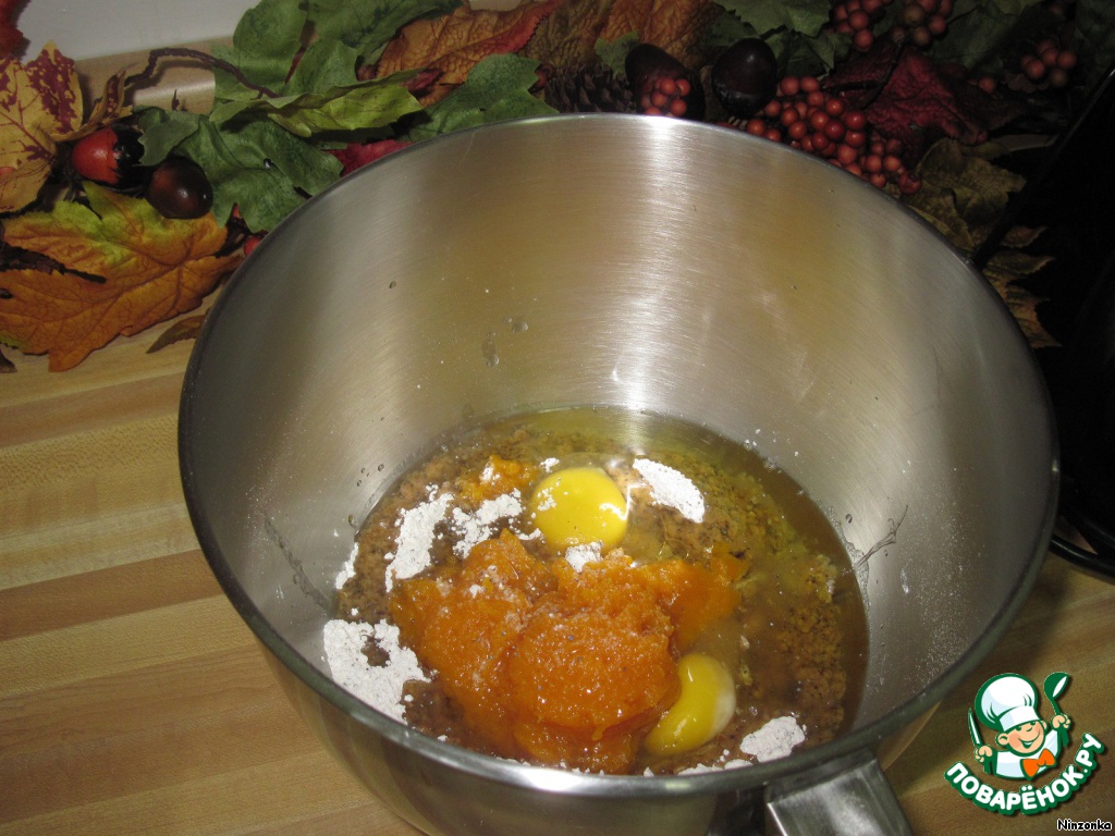 Делаем в этой смеси углубление и кладем туда яйца, пюре тыквы, масло и мед.