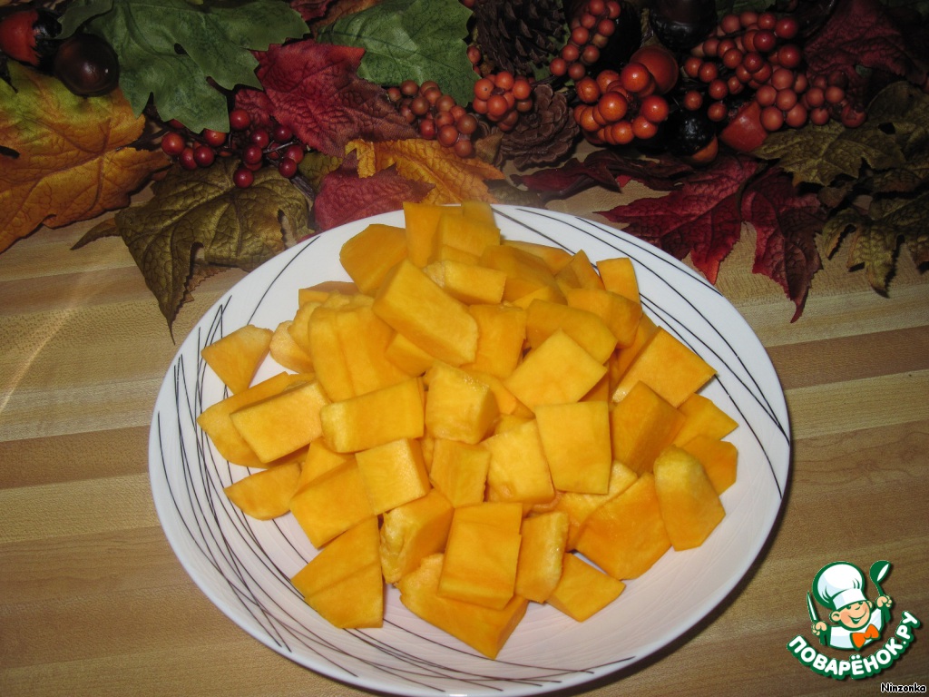 Если есть тыквенное пюре, то можно использовать его. Я делала из свежей тыквы. Для начала ее нужно почистить и нарезать.