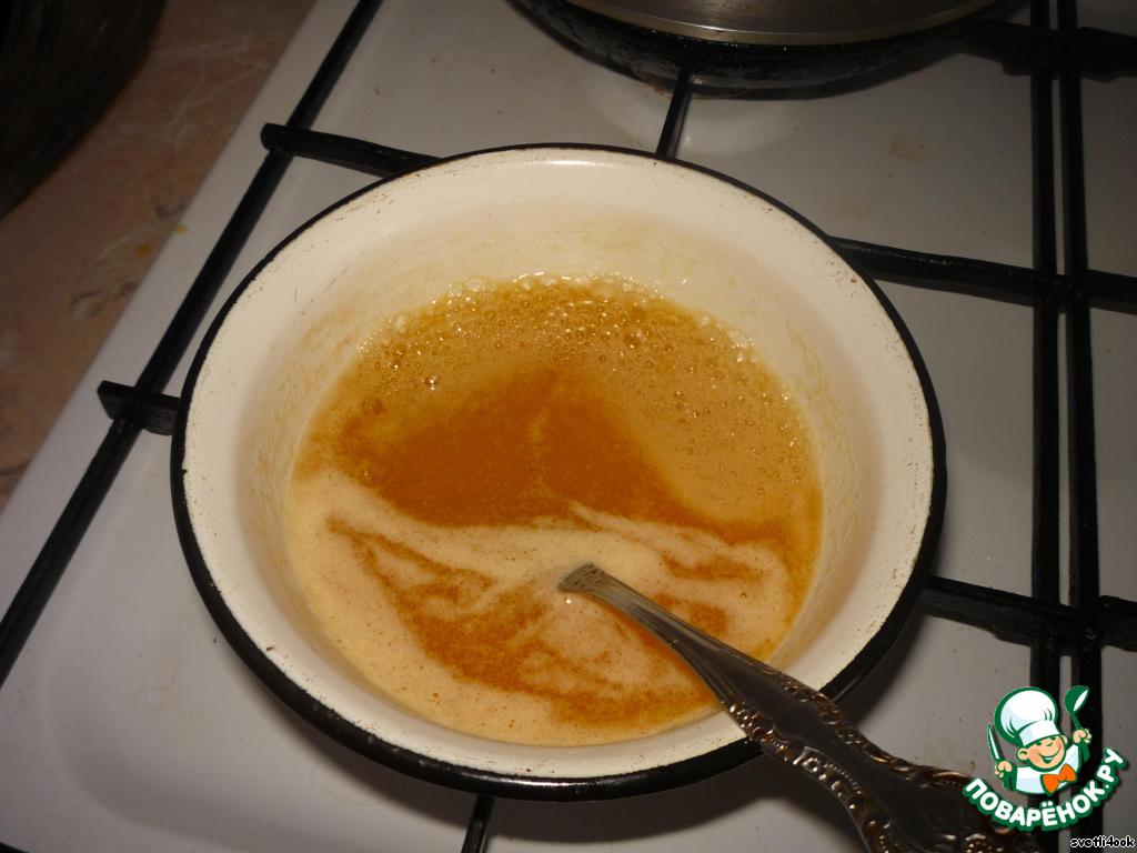 Добавить сахар и мед. Постоянно помешивать, держать на огне пока сахар полностью не растворится.