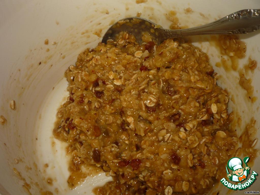 Смешать хлопья, орехи, изюм, цедру, банановое пюре. Влить масляную смесь и тщательно перемешать.
