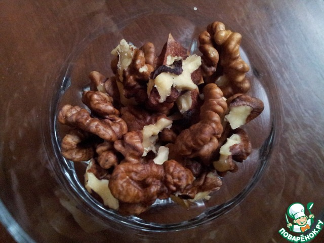 Орехи измельчить по вкусу, т. е. крупно, мелко кому как нравиться! Я давила скалкой в мелкую крошку, можно блендером
