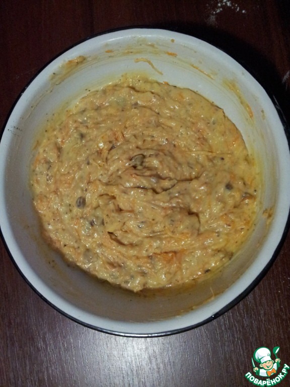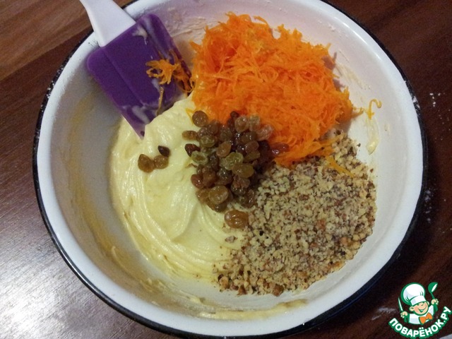 Добавляем в получившееся тесто тыкву, орехи и изюм. Хорошо вымешиваем