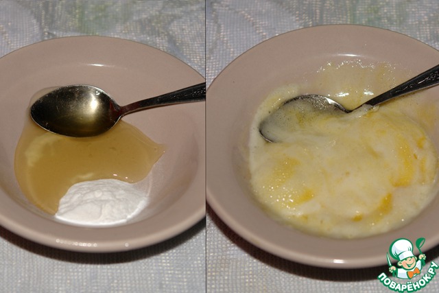 Добавляем оливковое масло и мед с содой, перемешиваем.